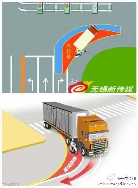 客车转弯时,后轮并不是沿着前轮的轨迹行驶。前内轮转弯半径与后轮转弯半径之间形成的偏差就叫内轮差。车身越长,内轮差就越大。大客车转弯时,如果只注意前轮通过,而忽视给后轮留有足够的余量,就可能造成内轮驶出路面或剐蹭行人和车辆.