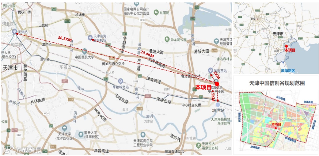 区位条件:本项目地处海洋高新区,毗邻天津滨海信息安全产业园,距离天津滨海新站2KM、距离塘沽站4.5KM、距离天津滨海国际机场23.4KM、距离天津站36.5KM,占据天津滨海新区和“中国信创谷”的核心位置,信创产业集聚发展。
