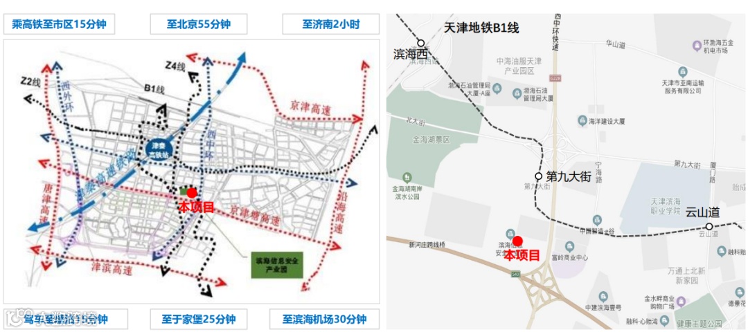 ◇轨道交通:本项目乘高铁至天津市区15分钟,至北京55分钟;驾车至塘沽15分钟,至于家堡25分钟,至滨海机场35分钟。距离津滨轻轨9号线胡家园站3公里。京滨城际铁路预计2022年9月通车,地铁B1线预计2024年12月通车,轨道交通利好兑现尚需时间。
