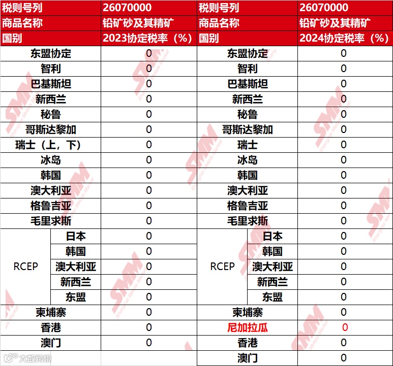 一、铅矿砂及其精矿:2024年的出口关税税率维持在30%。而协定税率方面,协定税率国家中新增了尼加拉瓜,税率为0。