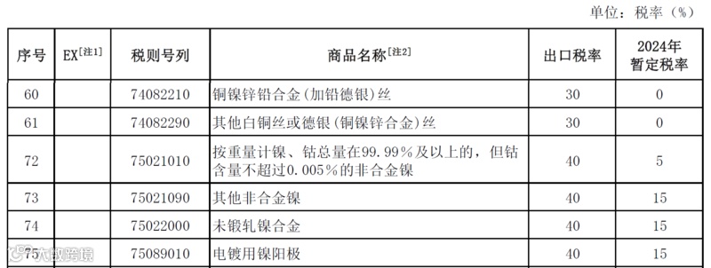 按重量计镍、钴总量在99.99%及以上的,但钴含量不超过0.005%的非合金镍出口税率为40%,2024年暂定税率为5%。
