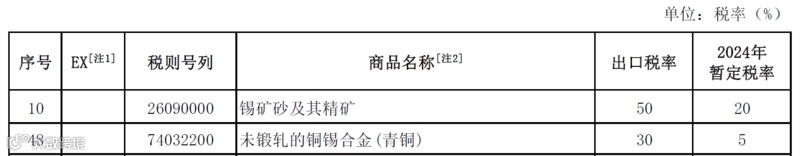 锡矿砂及其精矿出口税率为50%,2024年暂定税率为20%。
