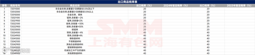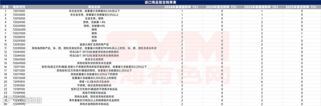 为继续发挥进出口对经济的支撑作用,更好履行关税在统筹国内国际两个市场两种资源中的重要职能,21日,国务院关税税则委员会发布公告,2024年将调整部分商品的进出口关税。据SMM整理,对钢铁相关产品进、出口关税调整较小,具体如下: