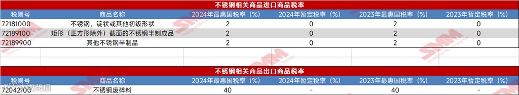 2024年的不锈钢相关产品出口税率并无调整变化,不锈钢,锭状或其他初级形状、矩形(正方形除外)截面的不锈钢半制成品、其他不锈钢半制成品(税则号:72181000、72189100、72189900)的进口税率以及不锈钢废碎料(税则号:72042100)具体涉及不锈钢相关产品进出口关税情况分别如下: