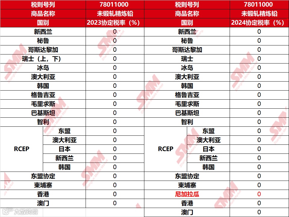 二、未锻轧精炼铅:协定税率国家中新增了尼加拉瓜,税率为0。