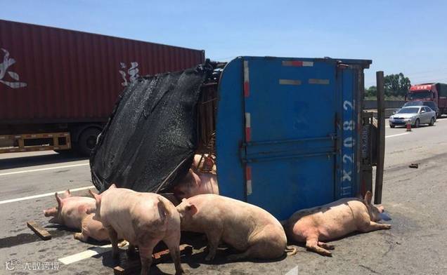 19日下午1时许,成雅高速第二绕城附近,雅安至成都方向,一辆送猪的货车后轮突然爆胎,引起侧翻,货栏里的30头猪也不能幸免,被重重甩在地上,很多再也没能起来。