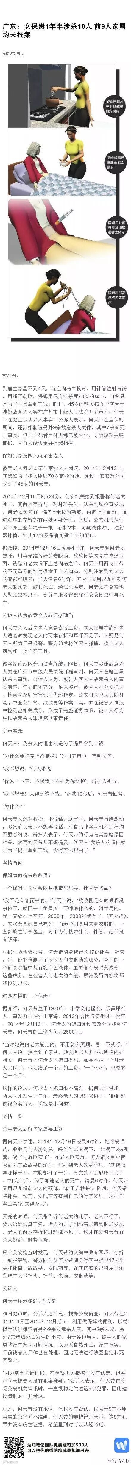 【恐怖!女保姆1年半内毒杀10老人 只为提前拿工资】去年12月,45岁的广州女保姆何天带到雇主家不到4天,就用汤中投毒、用针管注射毒汤等方式杀死70岁老人,自称只为早点拿到工钱。23日,何天带涉嫌故意杀人案在广州开审。据其供述,9人家属未报案。