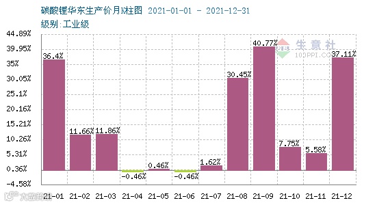 据生意社数据监测显示:2021年碳酸锂产品可谓是上涨凶猛,全年价格都处于上行区间,临近年末价格更是一飞冲天。12月31日工业级碳酸锂华东地区均价价格为266000元/吨,与年初(1月1日工业级碳酸锂华东地区均价价格为50000元/吨)相比价格上涨了432%。12月31日电池级碳酸锂华东地区均价价格为282000元/吨,与年初(1月1日电池级碳酸锂华东地区均价价格为54600元/吨)相比价格上涨了416.48%。2021年碳酸锂价格出现了三轮相对大幅度的爬坡走势,价格更是不断的创下历史新高。
