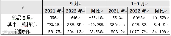 表 3 :2022年1-9月中国钨品出口情况,同比单位:吨)