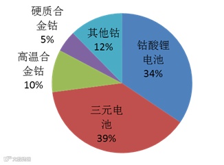 钴在锂电池中的应用占比约73%。其中钴酸锂电池占33%;三元电池占39%。