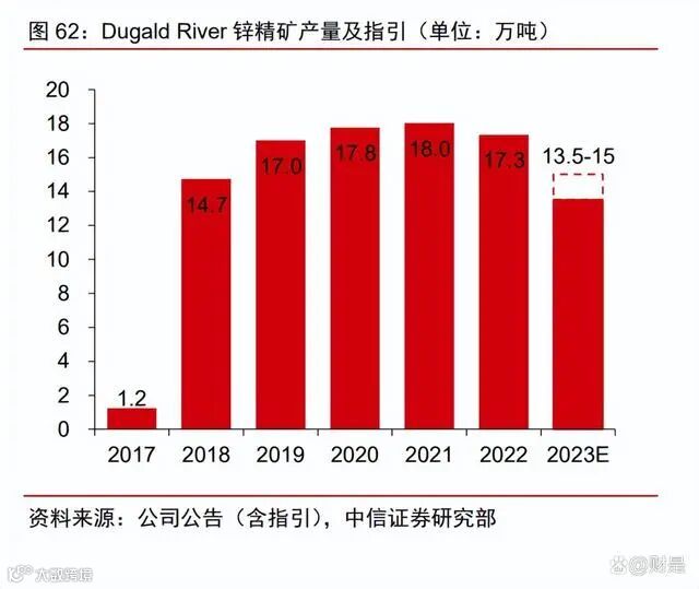 停产致使 Dugald River 下调 2023 年产量指引。Dugald River 项目位于澳大利亚, 是全球十大在产锌矿之一。Dugald River 于 2017 年底投产,实现对公司早期锌板块主力 矿山 Century 的替代。2019-2022 年,Dugald River 的矿产锌产量稳定在 17-18 万吨,2023 年受到一季度事故停产 34 天的影响,年度产量指引下修至 13.5-15 万吨。根据公司 2023Q2 生产报告,Dugald River 已于 5 月实现了采矿量和选矿量的全面恢复。Rosebery 已启动加速勘探计划以延长矿山寿命。Rosebery 项目也位于澳大利亚,是 一座累计服务超过 80 年的历史悠久的矿山。2019 年以前,Rosebery 的矿产锌产量均维 持在 7 万吨以上,后来受资源枯竭和疫情影响,产量中枢有所下滑,2022 年为 5.1 万吨。2023 年 1 月,公司启动未来两年的加速勘探计划,支持 Rosebery 寿命延长。