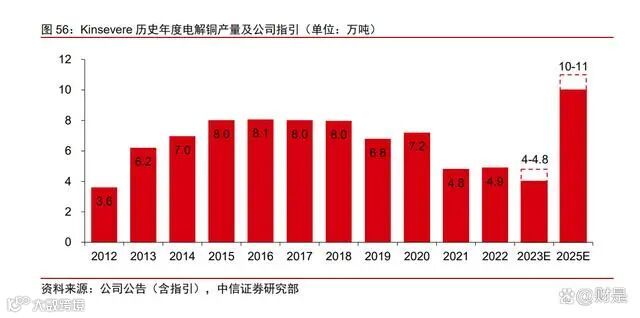Kinsevere 总体稳产多年,但近年产量有所下滑。Kinsevere 是公司全资拥有的一座 位于刚果的露天铜矿。2012 年,中国五矿集团以 13.3 亿加元收购加拿大 Anvil Mining 公 司,从而获得 Kinsevere 的 100%权益。2013-2020 年期间,Kinsevere 矿产铜年产量均 维持在 6 万吨以上,但随着露天氧化矿石的逐步耗尽,2021 年以来 Kinsevere 产量下滑 至 5 万吨附近,2022 年为 4.9 万吨。Kinsevere 扩建项目达产有望助力产量翻倍。为了充分开发利用矿山蕴含的硫化矿石 以及 2019 年首次勘探发现的钴金属资源,公司推动 Kinsevere 扩建项目(KEP)。公司预 计,项目达产后,Kinsevere 阴极铜年产量将增至 8 万吨,氢氧化钴含钴年产量达到 4000-6000 吨,铜当量年产量达到 10-11 万吨,现有的开发计划将使得矿山寿命延长至 2035 年。2022 年 3 月,公司董事会批准 Kinsevere 扩建项目。项目于 2022Q2 开始建设, 公司预计 2023H2 开始生产钴,2024 年首次从硫化物生产电解铜,2025 年全面达产。