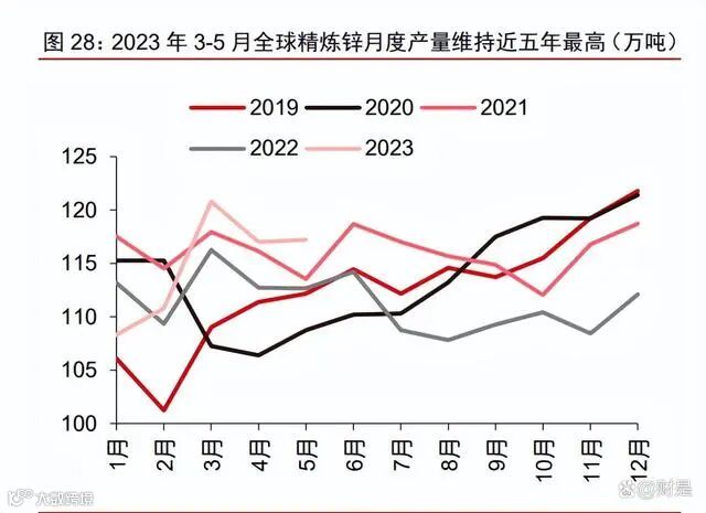 冶炼端扰动对于锌供给的影响逐步弱化。2022 年,在欧洲天然气价格高涨压制冶炼 利润的背景下,多家欧洲锌冶炼厂采取限产或减产措施,冶炼端成为锌产业链供给的核心 瓶颈。2023 年以来,随着天然气价格回落,前期受扰动的冶炼产能推进复产,全球精炼 锌的生产呈现良好的恢复态势。2023 年 3 月以来,全球精炼锌产量连续 3 个月维持近 5 年最高水平,2023 年以来的全球精炼锌月度产量的同比增速也持续高于锌精矿产量的同 比增速。我们认为,冶炼端扰动对于锌供给的影响已逐步弱化。