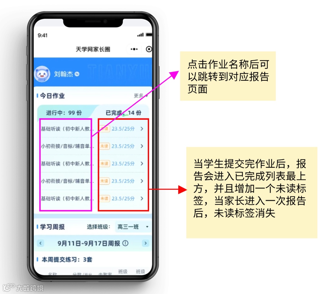 【孩子学情】页面与天学网学生APP实现数据联通,对学生本周产生的个性化错词和本周错题本中的错题次数进行了统计和展示。