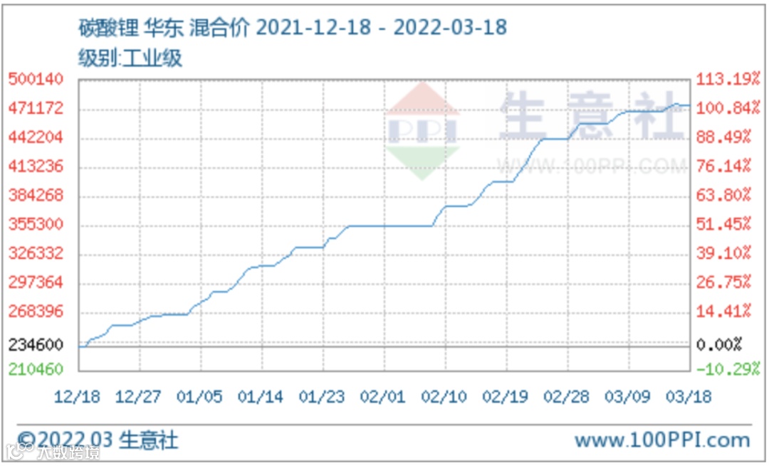 不过,进入3月份以来,碳酸锂价格持续上涨的势头正在趋缓。生意社数据显示,3月18日,工业级碳酸锂价格为475400元/吨,电池级碳酸锂价格为499600元/吨。目前下游市场对高价碳酸锂产品的接受度不高,在库存比较充足的状态下,下游市场基本保持观望状态,高价采购的态度趋于谨慎。