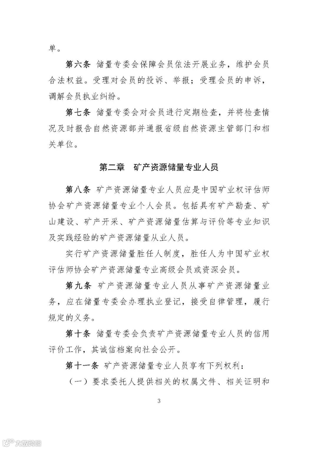 为贯彻落实《自然资源部关于推进矿产资源管理改革若干事项的意见(试行)》(自然资规〔2019〕7号),积极推进矿产资源储量市场服务体系建设,有效对接矿产资源储量报告国际通用标准,中国矿业权评估师协会矿产资源储量专业委员会制定了《固体矿产资源储量报告规则(试行)》,经会长办公会议研究决定,现予发布,请各单位会员和有关单位遵照执行,特此公告。
