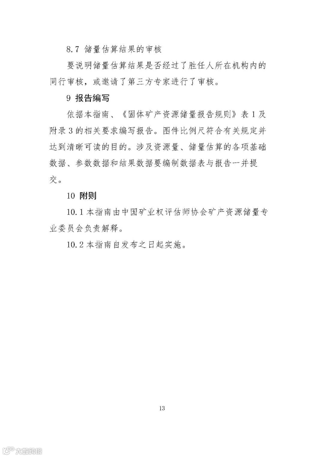 为贯彻落实《自然资源部关于推进矿产资源管理改革若干事项的意见(试行)》(自然资规〔2019〕7号),积极推进矿产资源储量市场服务体系建设,有效对接矿产资源储量报告国际通用标准,中国矿业权评估师协会矿产资源储量专业委员会制定了《固体矿产资源储量估算工作指南(试行)》,经会长办公会议研究决定,现予发布,请各单位会员和有关单位遵照执行,特此公告。