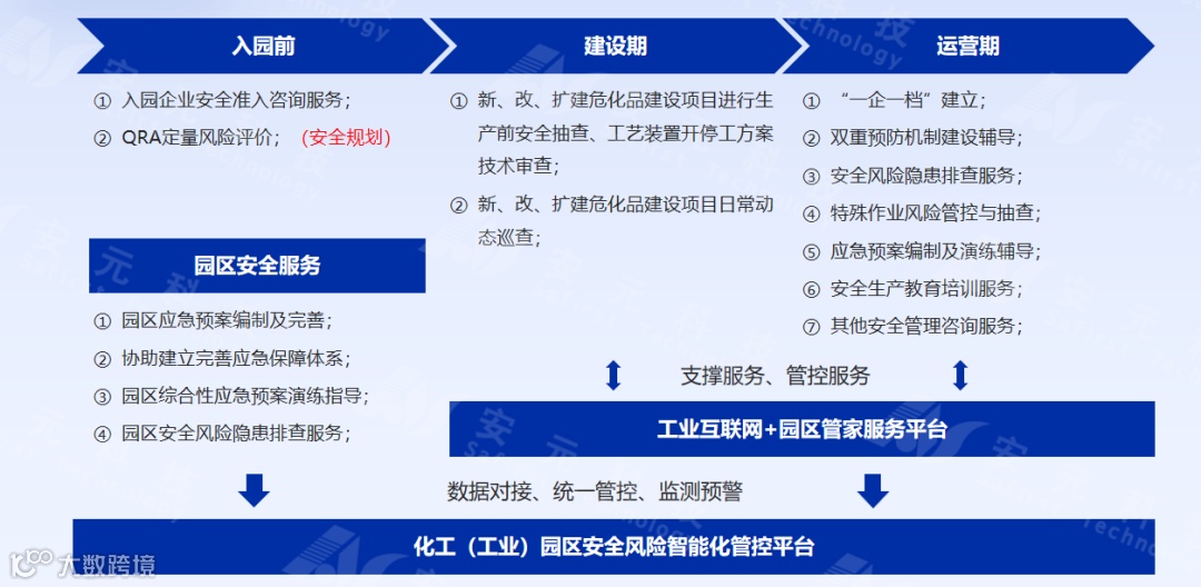 作为行业领先的智慧园区解决方案服务商,安元科技全新推出“园区管家服务”,同时创新性的运用园区管家服务平台,打造线上线下一体化服务模式,以安元专业服务团队、先进智能设备、行业领先技术为依托,为园区及企业提供安全、环保、应急、工艺等管家式服务,实现园区管家服务全过程在线监管、数据共享、互联互通,全面提高园区服务能力和服务效率,提升园区及企业的风险防控水平,为园区的安全环保驾护航。