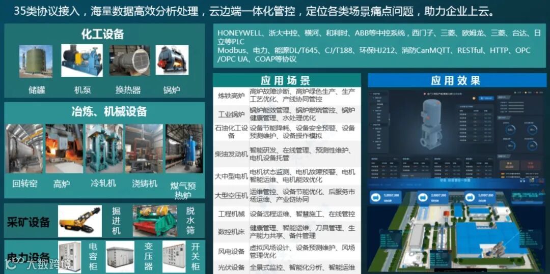 强大的设备连接能力,满足35类工业协议、50类设备及工控系统接入、边云协同管理、智能控制、数据分析及应用可视化要求。