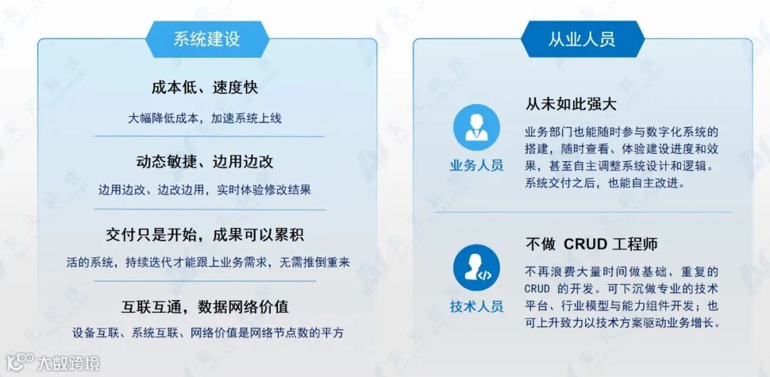 赞同者说低代码平台是效率工具,甚至在国内宣传起了无代码,极致效率,极低成本往往是通用的宣传手段。
