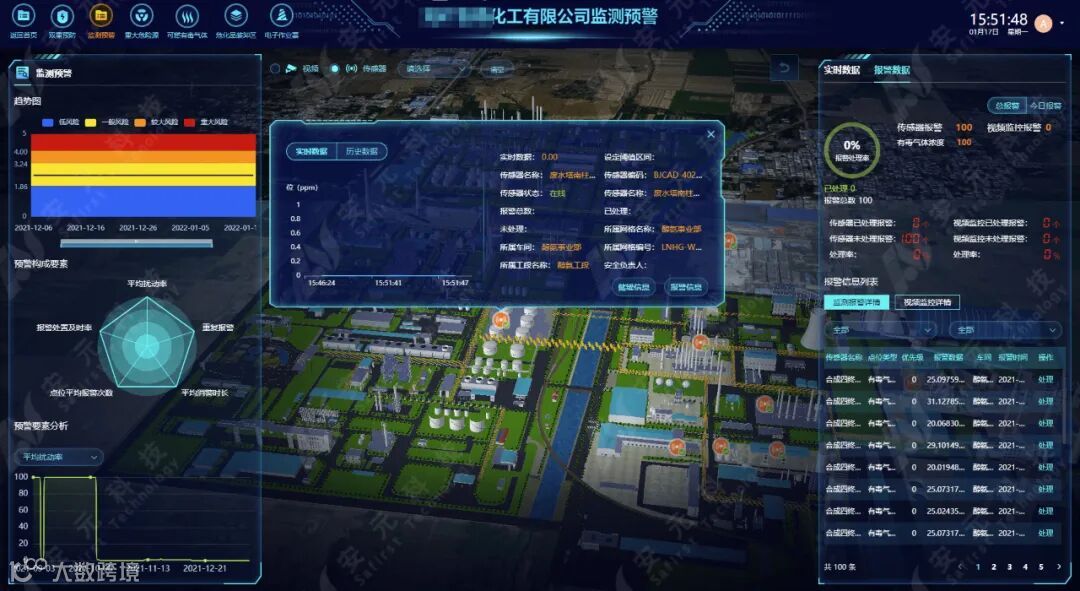 通过采集重大危险源储存设施及生产装置的静态数据信息、实时数据(温度、压力、液位和报警信息、视频画面等)和非实时数据,通过报警信息和业务信息多维度数据关联分析模型,实现对企业、安全生产状况及趋势分析,帮助企业对生产安全状态进行动态管控和预测预警。