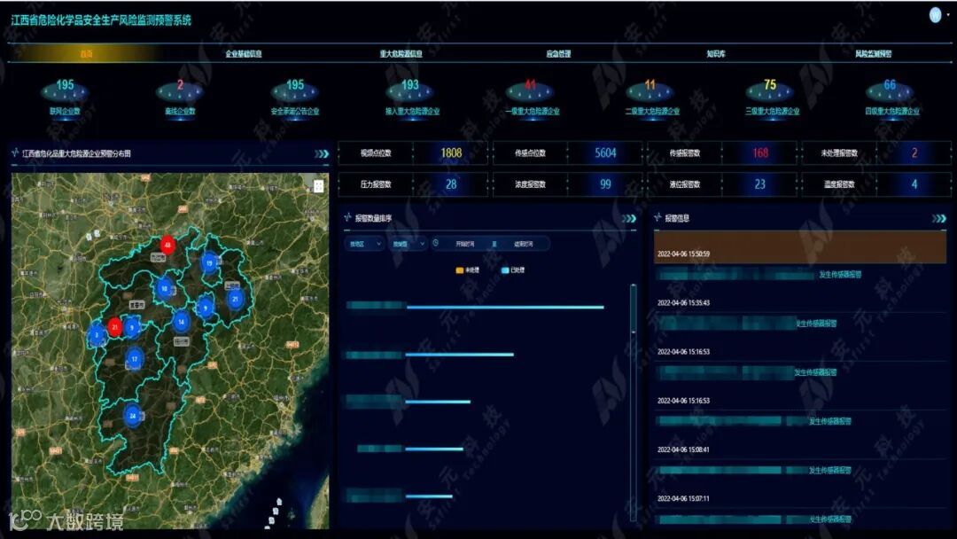 江西省危险化学品安全生产风险监测预警系统基于危险化学品登记管理系统、危险化学品 GIS 应用系统等基础数据,实现动态预警、风险分布、在线巡查、安全承诺等功能,为风险防范、风险态势动态研判、事故应急综合分析提供支持。