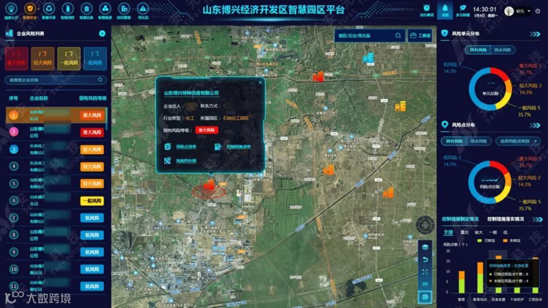 博兴经济开发区智慧园区平台对园区内企业重大危险源、重点监管危险化工工艺等物的不安全状态进行实时监测预警,建立园区风险分级管控、隐患排查治理双重预防机制。