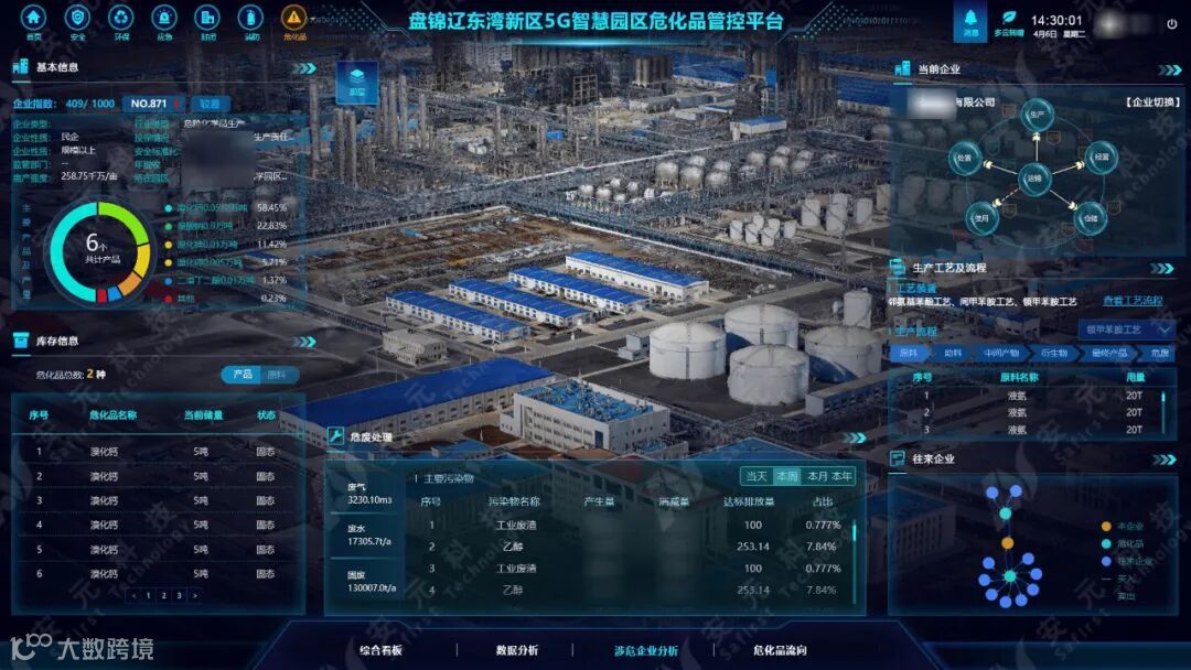 盘锦辽东湾新区智慧园区危化品管控平台以危化品监管为切入点,构建园区指数、企业指数、涉危企业风险预警指数模型,从危化品种类、储量、风险源多角度综合评估园区与企业的风险水平。