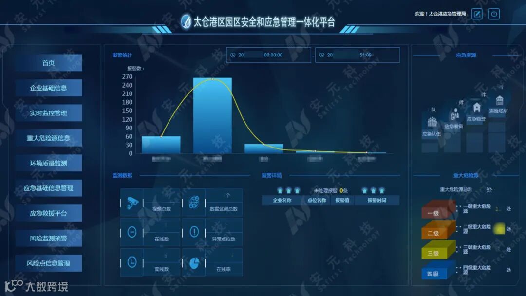 太仓港区园区安全和应急管理一体化平台全面接入园区内多个数据监测点及视频监控点,实时监测园区内重大危险源及高危工艺,可实现园区对企业重大危险源、值班室、重点区域、重点工艺的动态监管,并结合危险源分级预警技术体系实现了分级预警处置、数据趋势分析等功能。