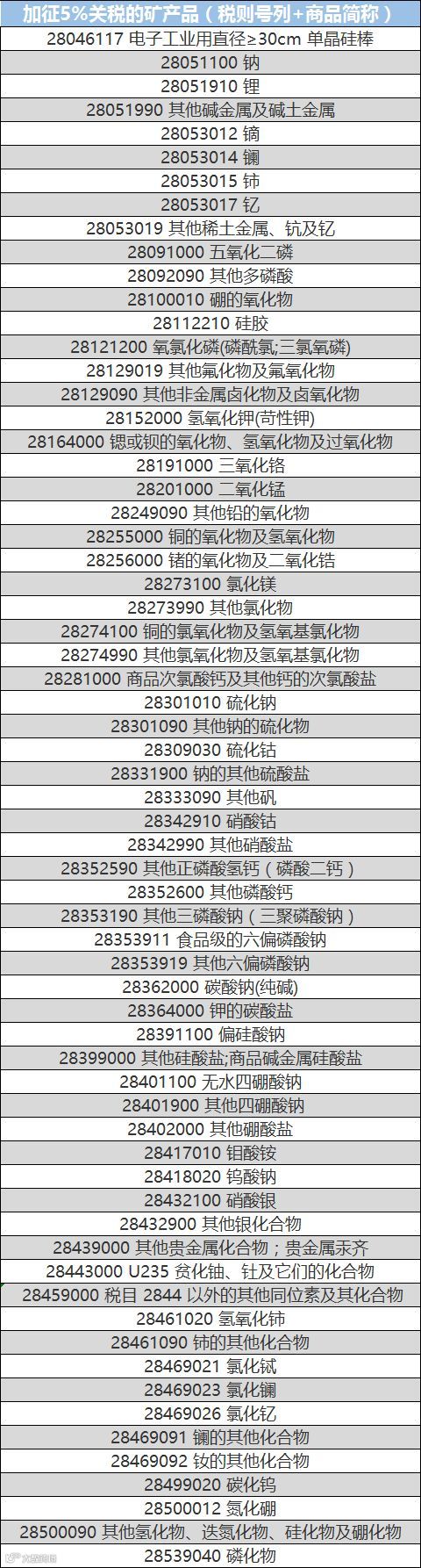 对美加征关税的商品中,这些矿产品及金属产品位列于清单中: