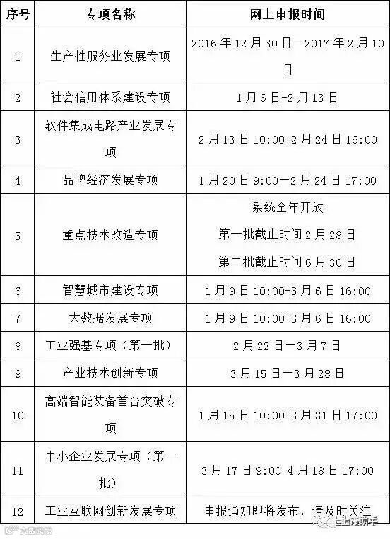 2017年伊始,上海市经济信息化委发布了重点技改、工业强基、产业技术创新、高端智能装备首台突破、软件集成电路产业发展、智慧城市建设、大数据发展等十余个领域2017年专项资金申报通知和指南,请有意向的小伙伴及时登录上海市经济和信息化委员会专项资金项目管理与服务平台(http://zxzj.sheitc.gov.cn)查询项目申报详细信息。