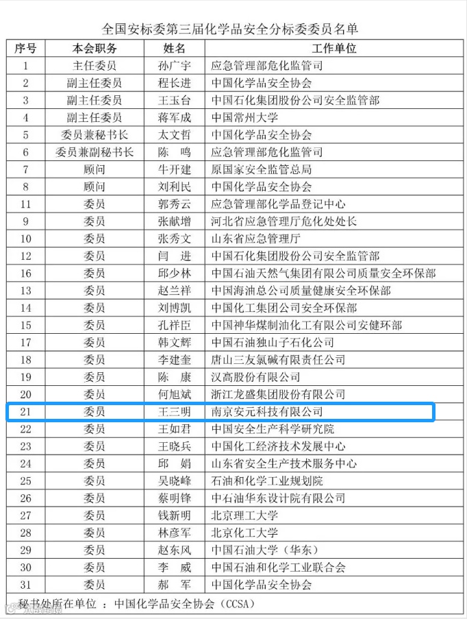 近日,国家标准化管理委员会发布公告,正式批准全国安全生产标准化技术委员会第三届化学品安全分技术委员会(以下简称化学品安全分标委)组成方案。至此,化学品安全分标委完成换届,正式进入工作状态。