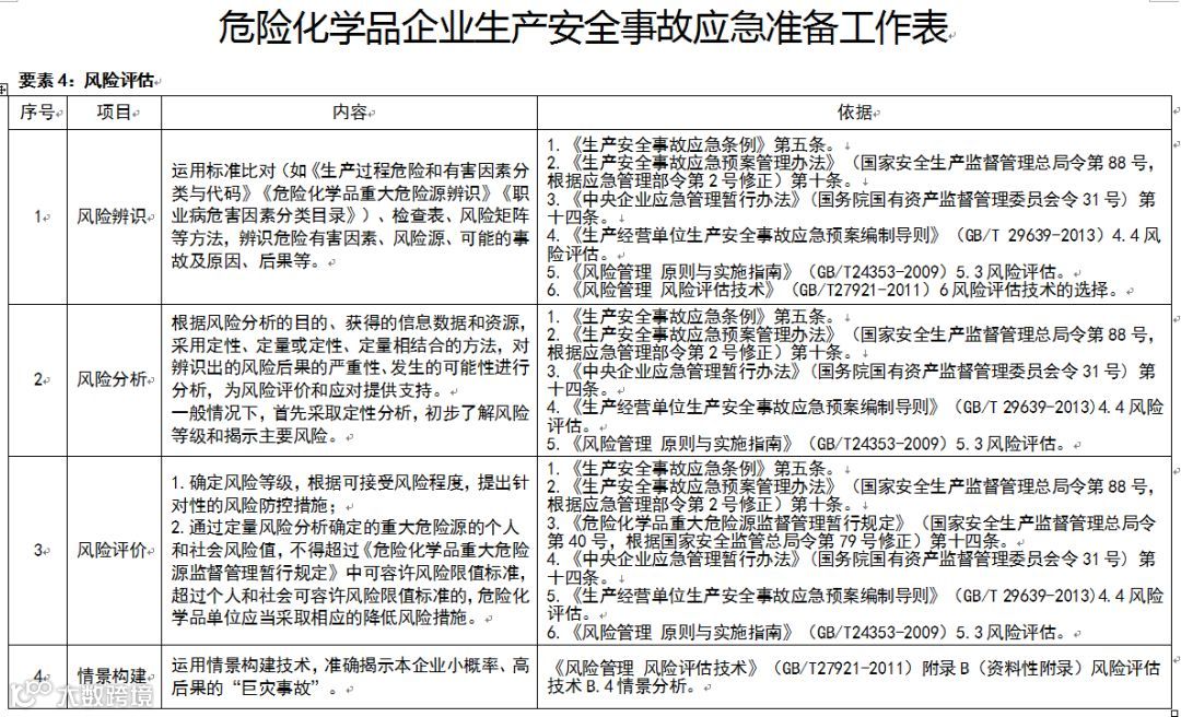 要素4:风险评估。风险评估是企业开展应急准备和救援能力建设的基础。危险化学品企业要运用底线思维,全面辨识各类安全风险,选用科学方法进行风险分析和评价,做到风险辨识全面,风险分析深入,风险评估科学,风险分级准确,预防和应对措施有效。运用情景构建技术,准确揭示本企业小概率、高后果的“巨灾事故”,开展有针对性的应急准备工作。