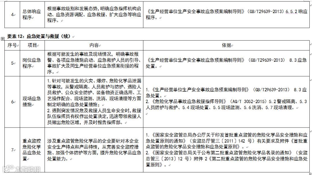 要素12:应急处置与救援。应急处置与救援是事故发生后的首要任务,包括企业自救、外部助救两个方面。危险化学品企业要建立统一领导的指挥协调机制,精心组织,严格程序,措施正确,科学施救,做到迅速、有力、有序、有效。要坚持救早救小,关口前移,着力抓好岗位紧急处置,避免人员伤亡、事故扩大升级。要加强教育培训,杜绝盲目施救、冒险处置等蛮干行为。