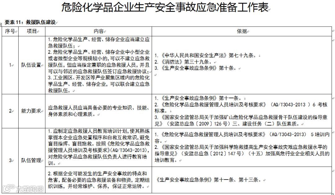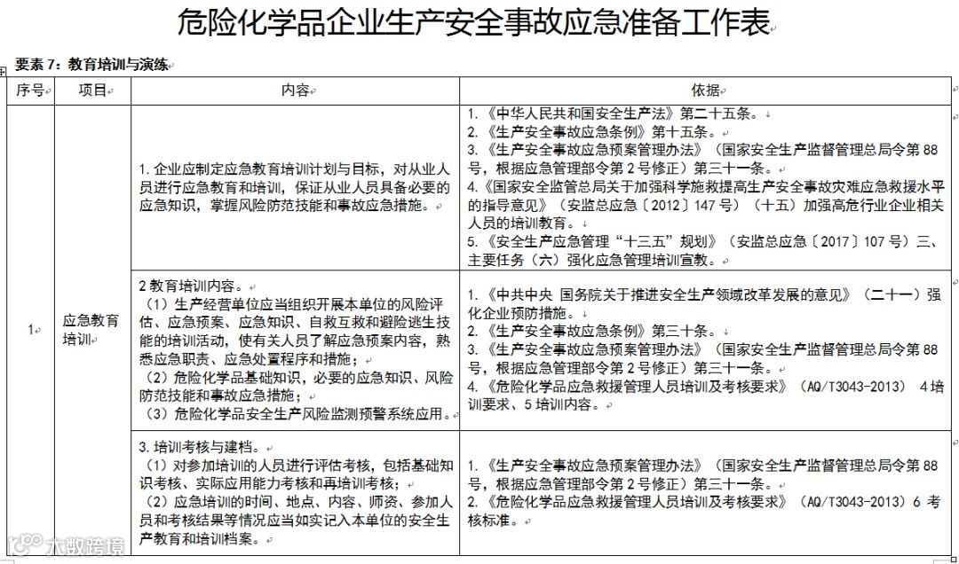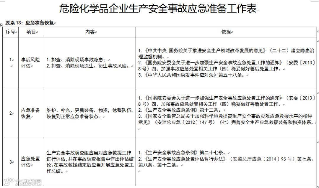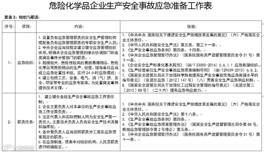 第五条 本指南依据现行相关法律法规制度细化明确了应急准备各要素所有项目的主要内容,详见附件《危险化学品企业生产安全事故应急准备工作表》。