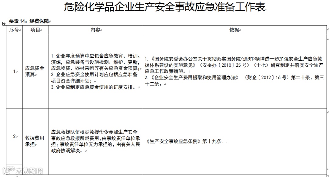 要素14:经费保障。经费保障是做好应急准备工作的重要前提条件。危险化学品企业要重视并加强事前投入,保障并落实监测预警、教育培训、物资装备、预案管理、应急演练等各环节所需的资金预算。