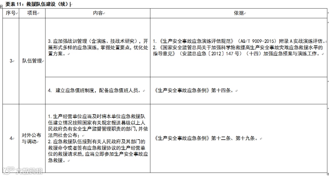 第四条 应急准备内容主要由思想理念、组织与职责、法律法规、风险评估、预案管理、监测与预警、教育培训与演练、值班值守、信息管理、装备设施、救援队伍建设、应急处置与救援、应急准备恢复、经费保障等要素构成。每个要素由若干项目组成。
