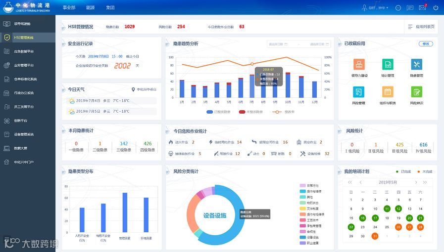■ 系统功能:中化物流港HSE管理子系统遵循标准化管理要求,采用移动应用、物联网、云计算和大数据等先进技术应用到HSE管理活动中,以人的不安全行为、物的不安全状态、环境的不安全因素以及安全管理作为四个基本对象,提升企业安全管控水平。