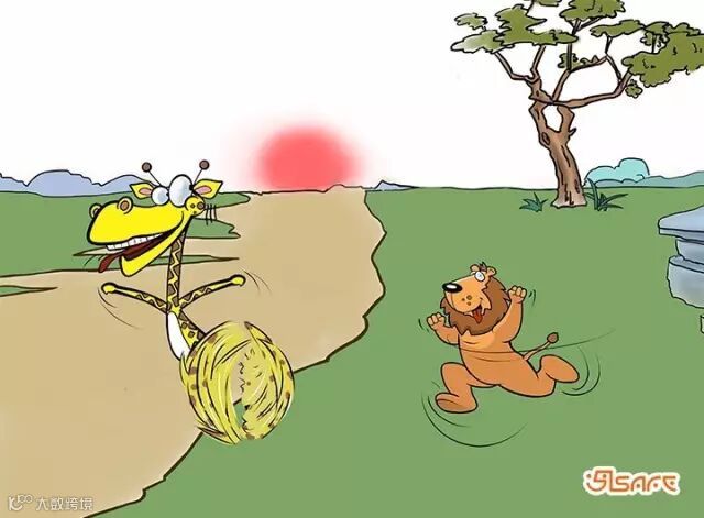 终于长颈鹿失去了耐心,胆怯了,撒腿飞奔,落荒而逃。狮子立即出击,紧追不舍,但它着实害怕长颈鹿的蹄子和头颅这两件税利的武器,不敢轻易靠近下口。