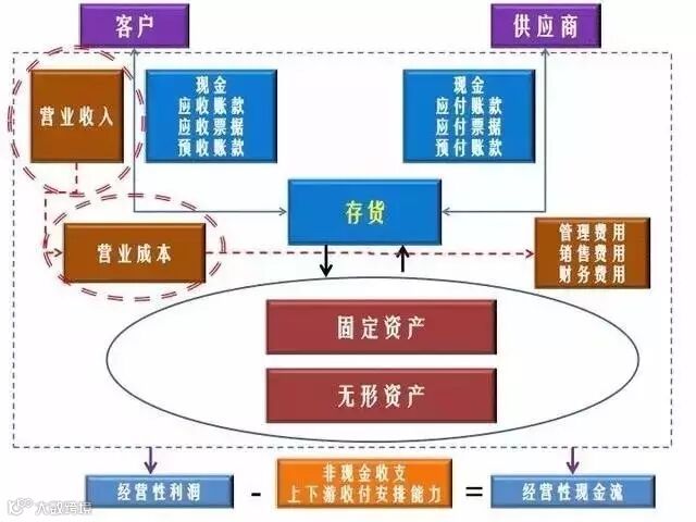 从图中可以看到,上游是供应商,然后通过现金、应付账款、应付票据、预付账款,然后会对公司形成存货,我们进行采购。采购完了以后这个存货通过固定资产、无形资产形成了产成品,然后我们把产成品销售给我们的客户,如果我们能收回现金我们就会得到现金,如果我们不能收回现金,那有可能我们会影响应收账款或者是应收票据。如果我们的产品非常地好,比如说像茅台这样的产品,如果你不给它提前打款拿不到货的,所以它会有预收账款,我们发生了销售收入的同时,同时会确认营业成本。每隔一段时间会发现三大期间费用,管理费用、销售费用、财务费用,这就是一个基本的整个供应链的体系。