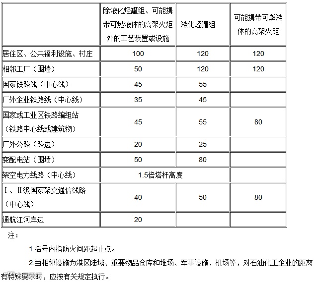 石油化工企业与相邻工厂或设施的防火间距 表3.1.7