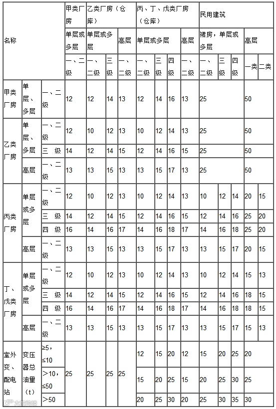 表3.4.1 厂房之间及其与乙、丙、丁、戊类仓库、民用建筑等之间的防火间距(m)