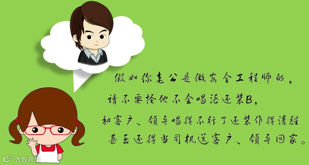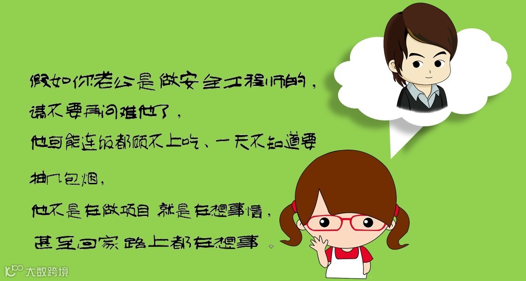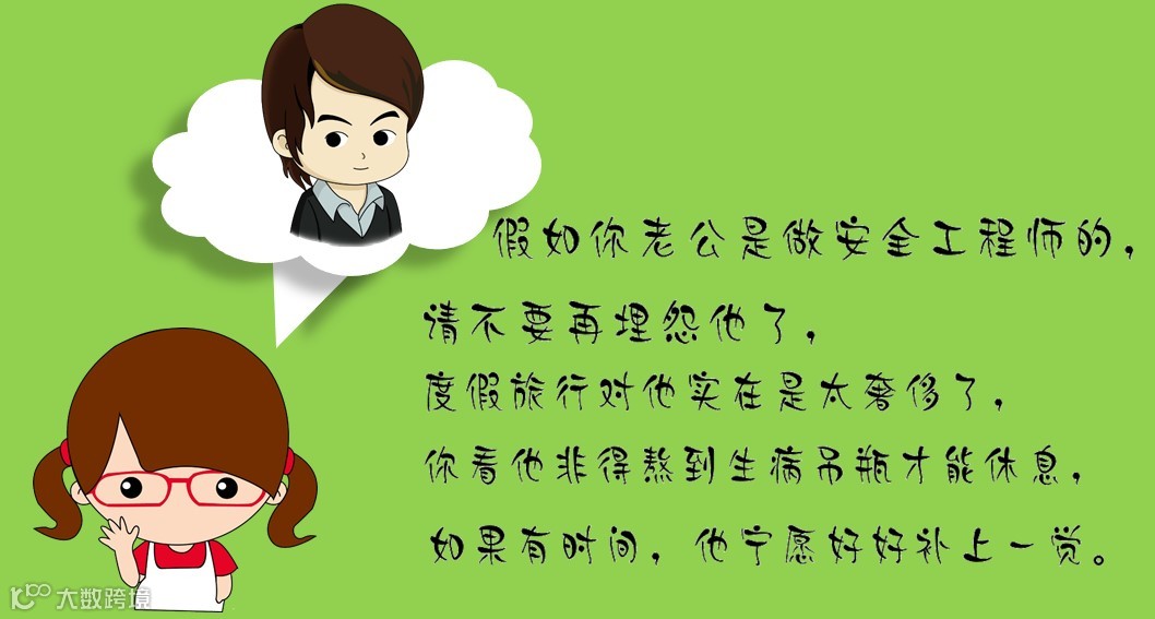 安全工程师,白天奔赴在企业管控的第一线,为企业量身定制最安全的监察机制;下班,他又要扮演起好爸爸、好儿子,做一个家庭好男人。工作的压力、养家糊口的重担,这个时候,他需要的是一位善解人意的老婆大人。假如你老公是做安全工程师的,请为他多着想……