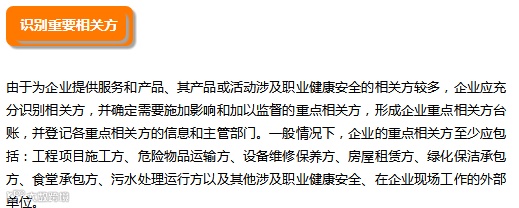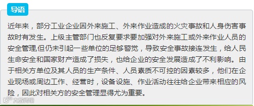 相关方人员在进入企业前必须接受企业的安全培训,学习企业的相关制度,掌握必要的安全常识,安全规程及劳动纪律和其它安全规定,必要时可采用抽查的方式进行培训效果验证。