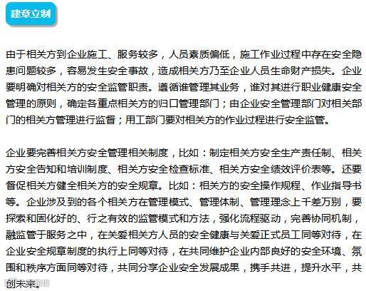 总之,企业相关方安全管理的要点就是要明确对相关方的监管职责、监管流程、监管模式、监管标准,通过落实对相关方施工、服务的监督职责,使相关方人员安全作业环境得到改善,使施工、服务过程中用到的设备设施处于安全状态,提高相关方的安全绩效,降低相关方在施工、服务中的风险,才能提升企业的安全保障能力。