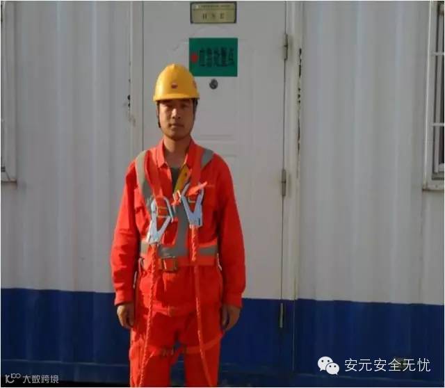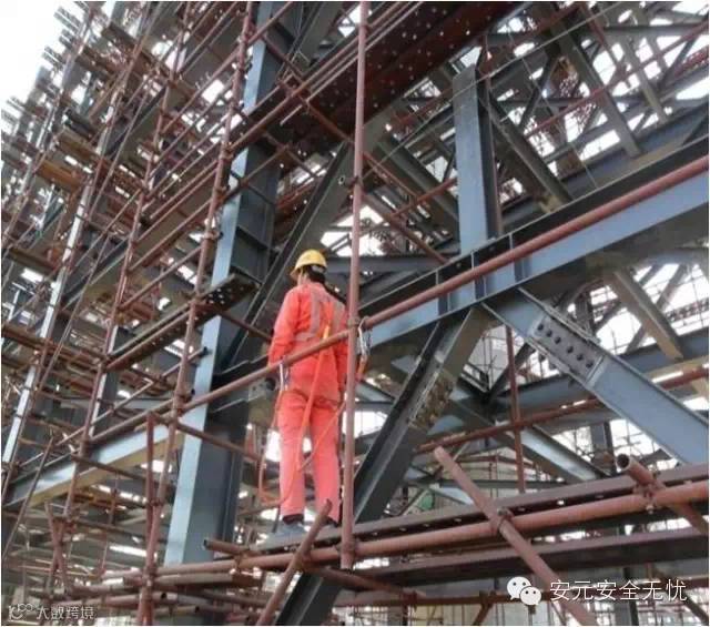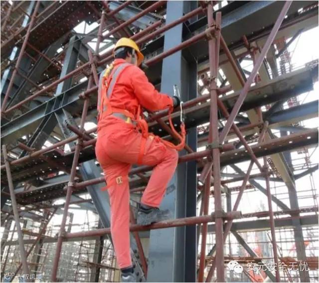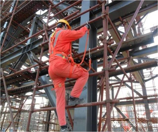 先把安全带两个挂钩挂在头部上方位置,开始爬脚手架,当上到腰部位置时,摘下一个挂钩挂到头部上方位置。重复此步骤,上下。