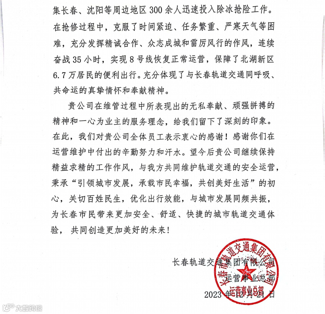 信中指出,长春维管项目部在长春市轨道交通的线路检修、应急处理、故障修复、值守保障和专项排查治理工作履职尽责,始终保持高度的专业水准和敬业精神,引进使用的 GPS 北斗定位系统及智能安全帽等设备,显著提高了工作和管理效率。同时,在近日长春轨道交通8号线因冻雨出现险情后,长春维保项目部第一时间抽调人员组织成立应急救援小组,抽调300余人连续奋战35小时抗冰除雪,最终实现8号线恢复正常运营,保障北湖新区6.7万居民的便利出行。