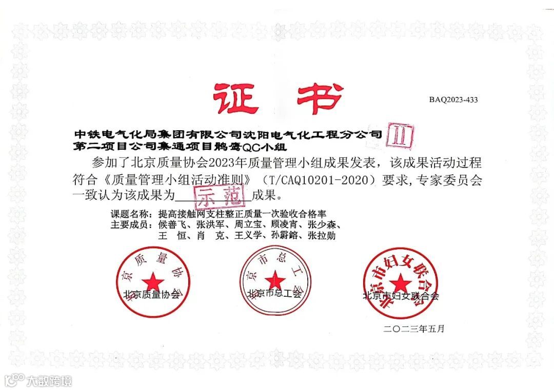发布会现场,QC小组成员讲述流畅,发布成果材料数据详实、步骤完整,充分展现了科学严谨和积极向上的企业风貌,得到了现场评审专家的肯定和认可。经过激烈的角逐,沈阳电化公司第四项目公司集通项目探索之星QC 小组《直流转辙机试验箱的研制》获中国铁道工程建设协会2023年度QC小组活动成果交流会一等奖;第二项目公司集通项目鹘鹰QC 小组的《提高接触网支柱整正质量一次验收合格率》、长春地铁6号线冬天里的一把火QC 小组的《地铁主变二次就位液压装置的研制》和第五项目公司铁伊项目动力班QC小组的《钢轨接续线挝线器的研制》均获北京市二等奖。