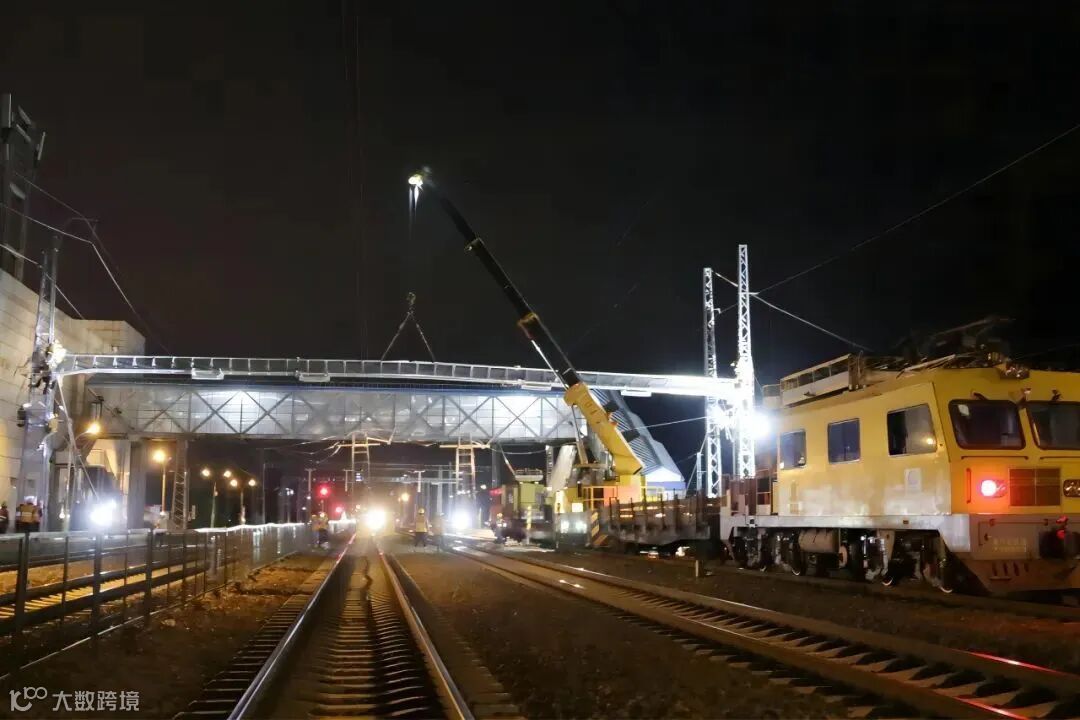7月26日,凌晨五点,暴雨后的哲里木站渐趋平静,略显昏暗的天色中,一组组崭新的硬横梁如彩虹横在空中。