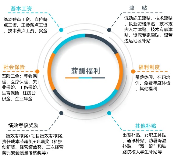 双一流、铁路院校从事技术管理类的主专业毕业生,入职时可领取一次性生活补贴10000元,同时实行特殊补贴,标准为1000元/月,补贴3年,见习期月均综合收入硕士研究生不低于7500元,本科生不低于6500元。